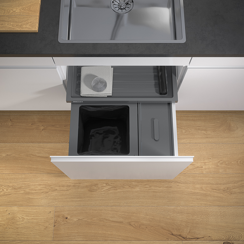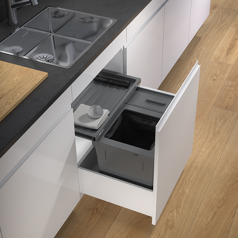 Anthrazit. Für jede handelsübliche Auszugsschublade mit einer Schubladentiefe von 400 - 500 mm. Für Korpuswandstärke 16 / 19 mm. Mit niedrigen Küchenschränken muss man nicht auf grosse Zusatzbehälter verzichten. Die neue Systemvariante für 600 mm breite Korpusse wurde für niedrigere Einbauhöhen konzipiert und verfügt trotzdem über einen extragrossen Recycling- und Staubehälter. Im 15 Liter fassenden Behälter können grössere Mengen an Bioabfällen, voluminösere Recyclinggüter oder Putzutensilien untergebracht werden. Zudem umfasst die Garnitur den 35 Liter Hauptbehälter für den Müllsack und die Basicschublade für weitere Ablagefläche über dem Abfalltrennbehälter. Einfachere Sackeinspannung mit vier beweglichen Sackspannern.