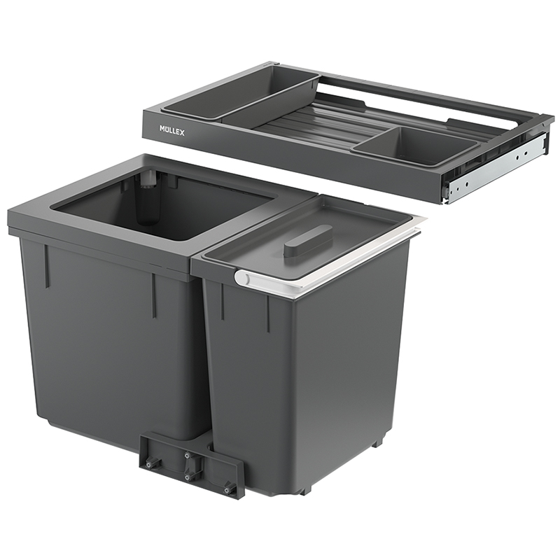 Anthrazit. Für jede handelsübliche Auszugsschublade mit einer Schubladentiefe von 400 - 500 mm. Für Korpuswandstärke 16 / 19 mm. Das Modell für Korpusse mit einer Breite von 600 mm und speziell konzipiert für niedrigere Küchenunterschränke, überzeugt mit einem besonders grossen Zusatzbehälter. Der 15 Liter fassende Staubehälter eignet sich optimal für Haushalte, die noch mehr Platz für einzelne Recyclinggüter oder Putzutensilien benötigen. Im 15 Liter fassenden Behälter können grössere Mengen an Bioabfällen, Recyclinggüter oder Putzutensilien untergebracht werden. Ergänzt wird die Garnitur mit dem 35 Liter Hauptbehälter für den Müllsack und der X-LINE Premiumschublade. Neben einem Vollauszug verfügt diese Ausführung der Schublade über zwei Zusatzschalen für mehr Ordnung und Komfort. Einfachere Sackeinspannung mit vier beweglichen Sackspannern.