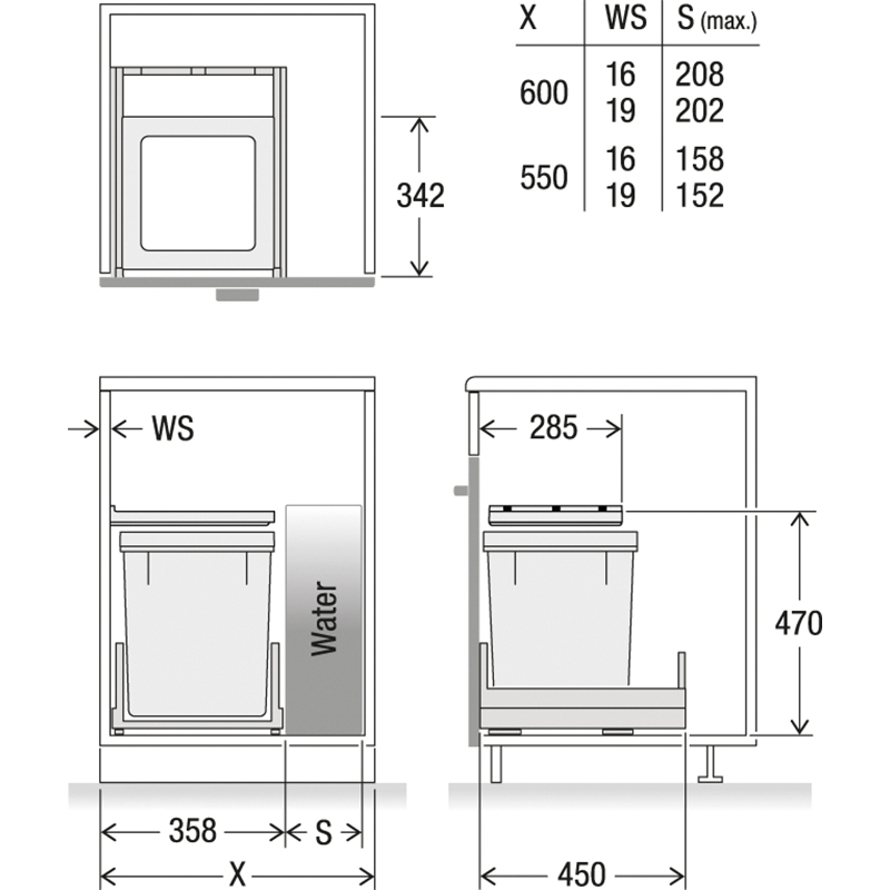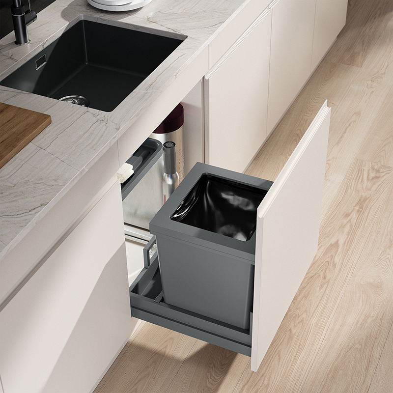 Dieses Komplettset ist die massgeschneiderte Lösung für Küchenunterschränke mit seitlich positionierten Wasseraufbereitungssystemen, das extra kleine System wurde speziell für Küchenunterschränke mit einer Breite von 550/600 mm konzipiert, der 40 Liter Hauptbehälter ist seitlich positioniert, um mehr Platz für zusätzliche Installationen zu bieten, und wird durch den Deckel ergänzt, der gleichzeitig als Ablagefläche dient, das System wird mit dem robusten Komplettschubkasten Pro geliefert