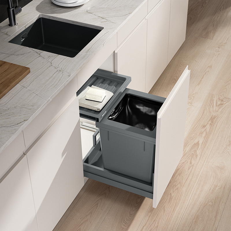 Das Komplettset bietet die passende Lösung für schmale Küchenkorpusse, bereits ab einer Korpusbreite von 450 mm kann dieses Modell verwendet werden, der Hauptbehälter mit einem Fassungsvermögen von 40 Litern ist geeignet für 35 oder 17 Liter Schweizer Gebührensäcke, die stabile Schublade Basic schafft bei wenig Platz zusätzlichen Stauraum, die Montage der Behälter erfolgt durch das ausgeklügelte X-LINE Ratschensystem besonders einfach, selbst auf kleinem Raum bietet dieses Modell eine praktische Müllentsorgung mit modernster Technologie, das System wird mit dem robusten Komplettschubkasten Pro geliefert