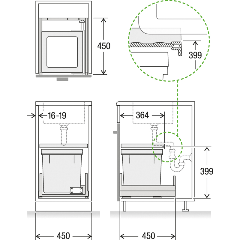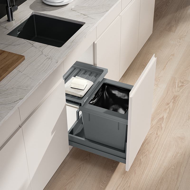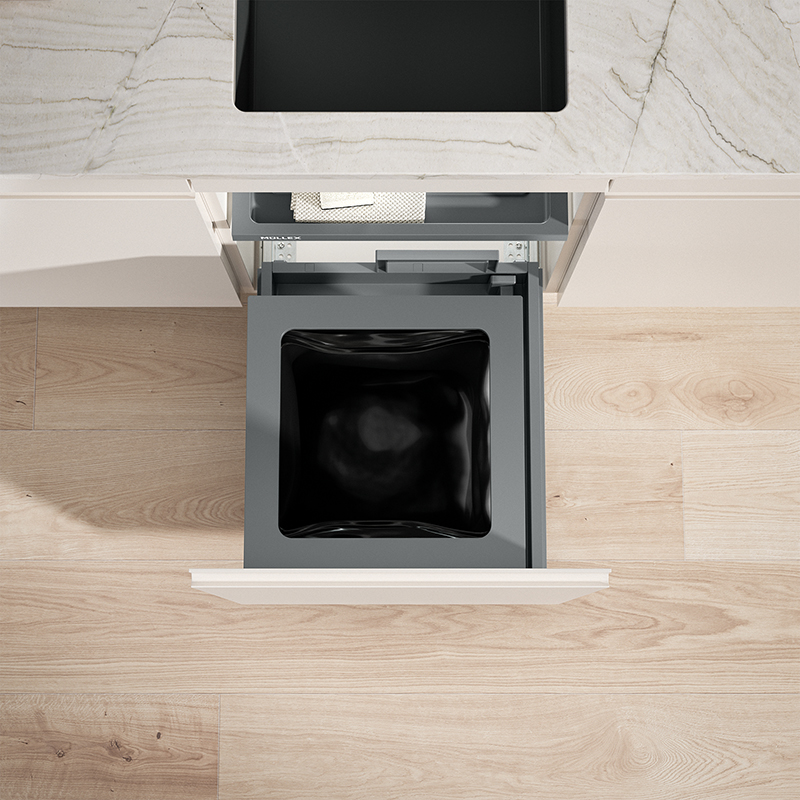 Das Komplettset bietet die passende Lösung für niedrige und schmale Küchenkorpusse, bereits ab einer Korpusbreite von 450 mm kann dieses Modell verwendet werden, der Hauptbehälter mit einem Fassungsvermögen von 35 Litern ist geeignet für 35 oder 17 Liter Schweizer Gebührensäcke, die stabile Schublade Basic schafft bei wenig Platz zusätzlichen Stauraum, die Montage der Behälter erfolgt durch das ausgeklügelte X-LINE Ratschensystem besonders einfach, selbst auf kleinem Raum bietet dieses Modell eine praktische Müllentsorgung mit modernster Technologie, das System wird mit einem robusten Komplettschubkasten geliefert