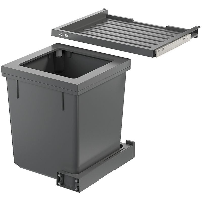 anthrazit, für jede handelsübliche Auszugsschublade mit einer Schubladentiefe von 400 - 500 mm, für Korpuswandstärke 16 / 19 mm, für Korpusse mit einer Breite von 500 mm besticht durch seine Schlichtheit, der Hauptbehälter mit einem Volumen von 40 Litern eignet sich optimal für die standardisierten 35 Liter Gebührensäcke, einfachere Sackeinspannung mit vier beweglichen Sackspannern, in dem 40 Liter Hauptbehälter werden die 35 oder 17 Liter Gebührensäcke richtig voll, Basicschublade als zusätzliche Ablagefläche