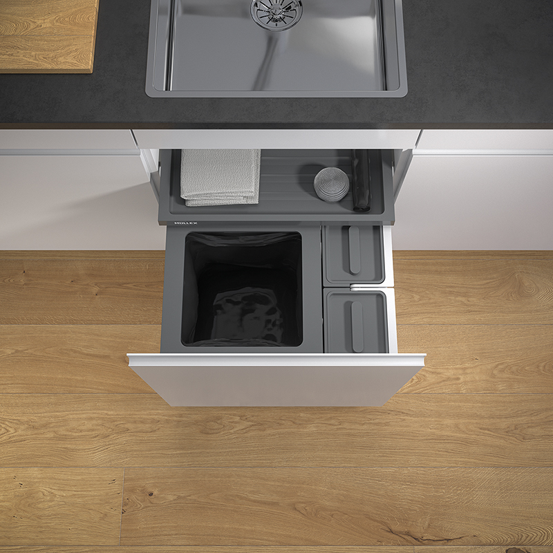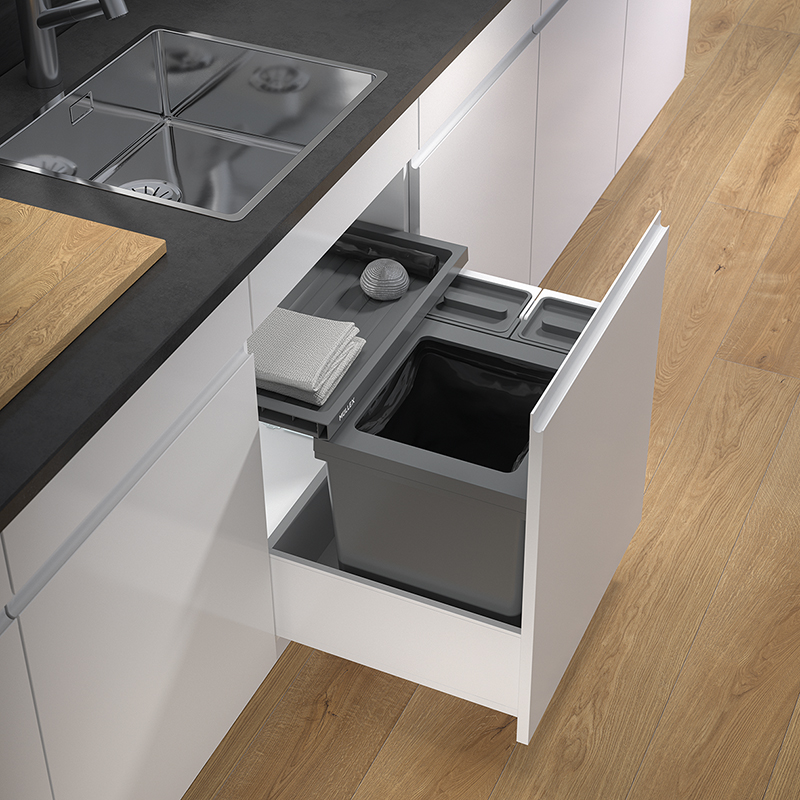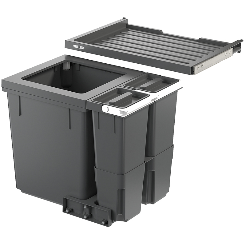 anthrazit, für jede handelsübliche Auszugsschublade mit einer Schubladentiefe von 400 - 500 mm, für Korpuswandstärke 16 / 19 mm, bei dieser Garnitur wird der 40 Liter fassende Hauptbehälter mit vier weiteren Behältnissen ergänzt, in den Behältern mit einem Volumen von je vier Litern können kleinere Recyclinggüter wie beispielsweise Kaffeekapseln gesammelt werden, die Behälter können dabei wahlweise links oder rechts vom Hauptbehälter positioniert werden, einfachere Sackeinspannung mit vier beweglichen Sackspannern, in dem 40 Liter Hauptbehälter werden die 35 oder 17 Liter Gebührensäcke richtig voll, Basicschublade als zusätzliche Ablagefläche