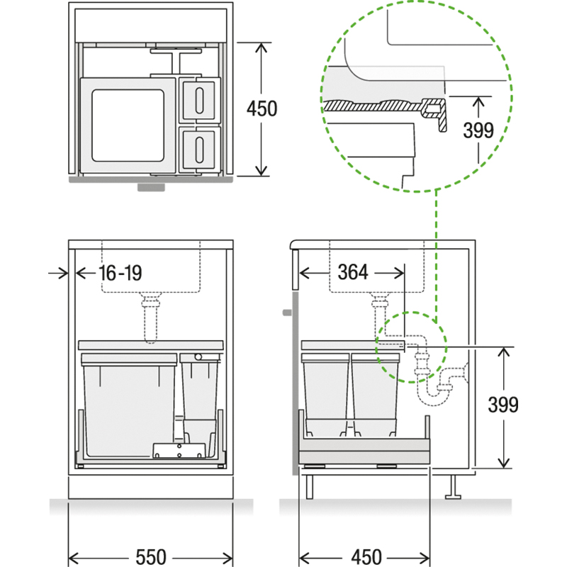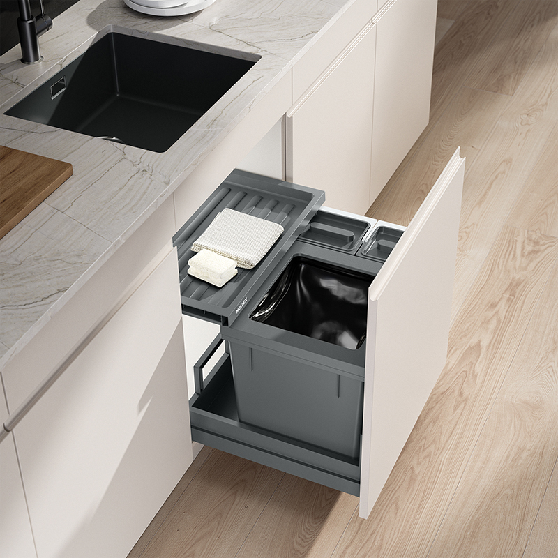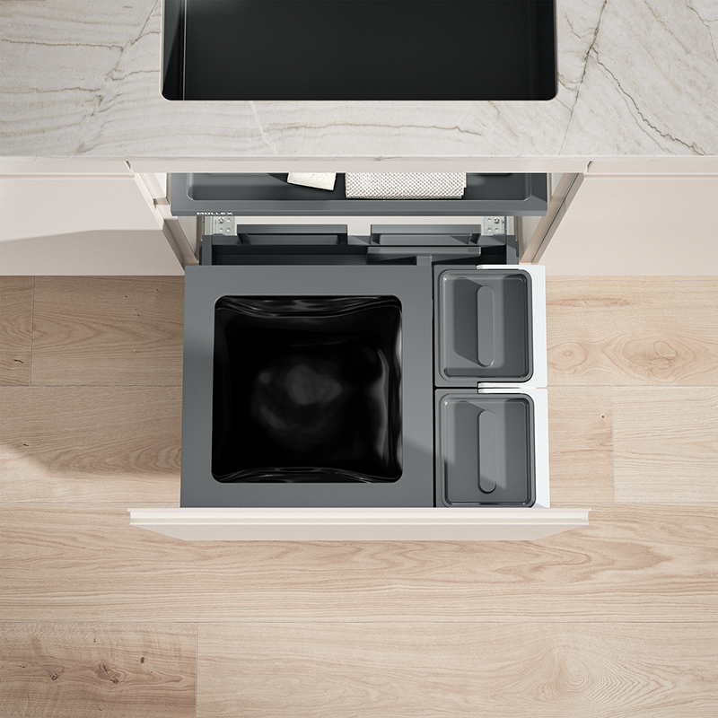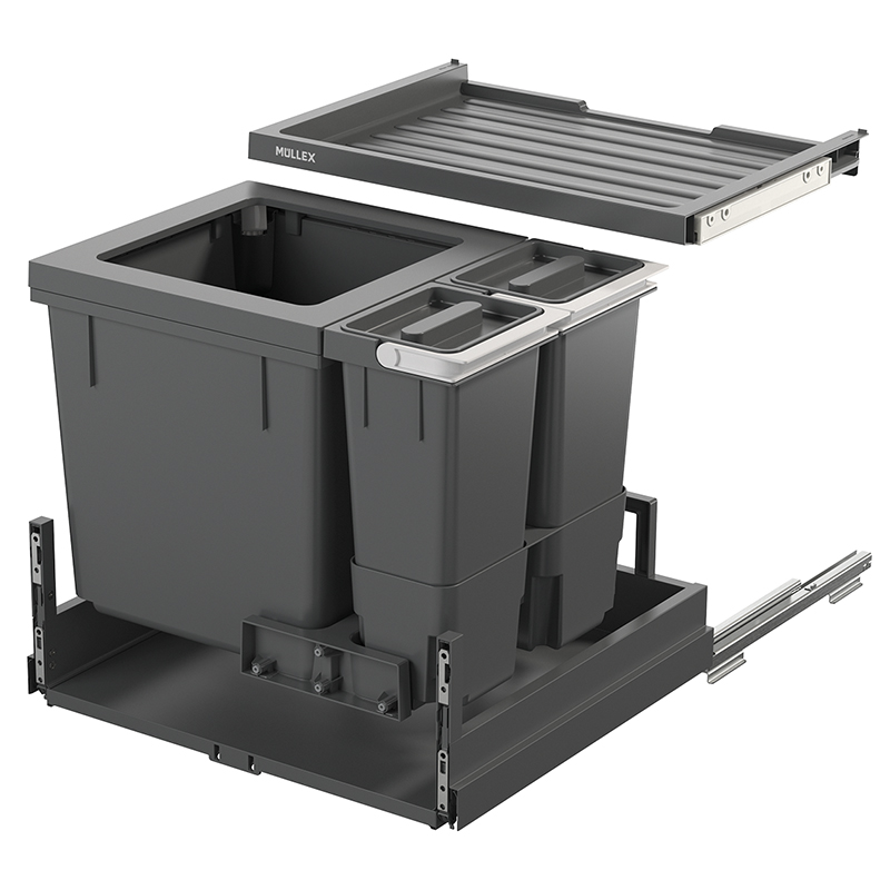 Dieses Komlpettset für eine Korpusbreite von 550 mm wurde für Haushalte mit niedrigeren Küchenkorpussen entworfen, es muss trotzdem nicht auf eine integrierte Möglichkeit zur Gütertrennung und Aufbewahrung verzichtet werden, für den Müllsack ist der 35 Liter grosse Hauptbehälter optimal, die zwei Zusatzbehälter mit je 4 Liter Volumen bieten Platz, um zum Beispiel Biomüll zu sammeln oder Geschirrspültabs zu lagern, die Behälter können dabei wahlweise links oder rechts vom Hauptbehälter positioniert werden, im Set zudem enthalten ist die Schublade Basic, die zusätzliche Ablagefläche bietet, das System wird mit dem robusten Komplettschubkasten Pro geliefert