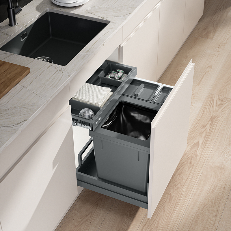 Dieses Premium Komplettset für die 550 mm Koprusbreite verfügt mit sieben Behältern über nahezu unbegrenzte Möglichkeiten zur Gütertrennung und Aufbewahrung, die zusätzlichen Stauräume sind besonders zum Sammeln kleinerer Recyclingstoffe wie Kaffeekapseln, Biomüll oder Batterien nützlich, die Schubalde Premium mit Vollauszug lässt sich vollständig als obere Ablagefläche nutzen, dank den zwei darin integrierten Zusatzschalen können Putzutensilien und Küchenhelfer ordentlich versorgt werden, ebenfalls im Set enthalten ist der 40 Liter grosse Hauptbehälter für den Müllsack, das System wird mit dem robusten Komplettschubkasten Pro geliefert
