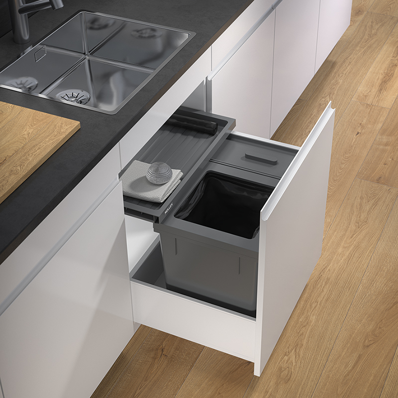Anthrazit. Für jede handelsübliche Auszugsschublade mit einer Schubladentiefe von 400 - 500 mm. Für Korpuswandstärke 16 / 19 mm. Diese X-LINE Ausführung für Korpusse mit einer Breite von 600 mm überzeugt mit einem extragrossen Zusatzbehälter. Der Zusatzbehälter bietet sich als Aufbewahrungsort für grössere Mengen an Biomüll, Recyclinggüter oder Putzutensilien an. Herzstück des Sets ist der 40 Liter fassende Hauptbehälter für den normalen Haushaltsmüll. Komplettiert wird dieses Abfallsystem mit der Basicschublade für noch mehr Ablagefläche und Stauraum. Einfachere Sackeinspannung mit vier beweglichen Sackspannern. In dem 40 Liter Hauptbehälter werden die 35 oder 17 Liter Gebührensäcke richtig voll.