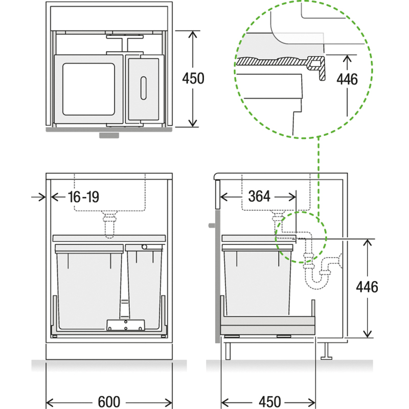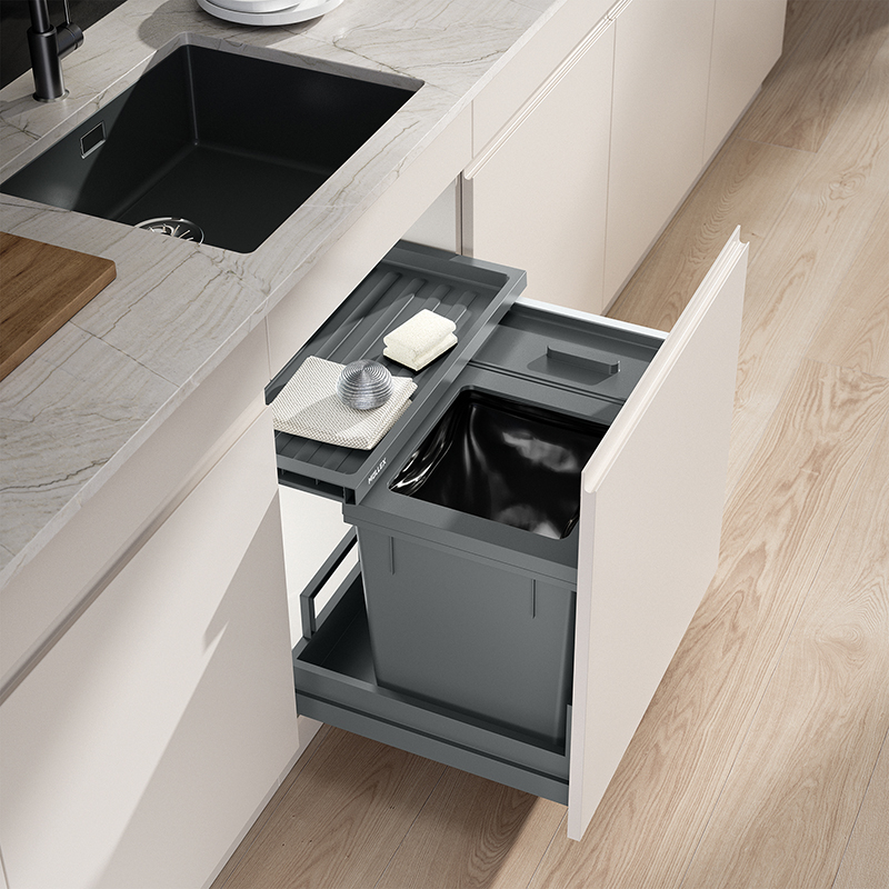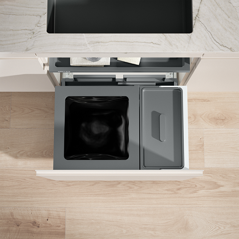 Dieses Komplettset für die Koprusbreite 600 mm bietet einen grossen Zusatzbehälter für noch mehr Platz zum Recyclen und Verstauen, ausgestattet mit einem 40 Liter fassenden Hauptbehälter und einem 18 Liter grossen Zusatzbehälter bietet das Abfallsystem genügend Raum für den gemischten Haushaltsmüll und Recyclinggüter, weiteren Stauraum für Spülschwämme und Co. bietet die Schublade Basic, das System wird mit dem robusten Komplettschubkasten Pro geliefert