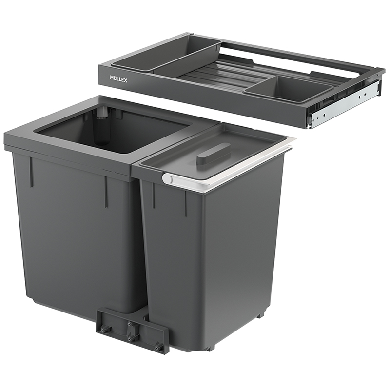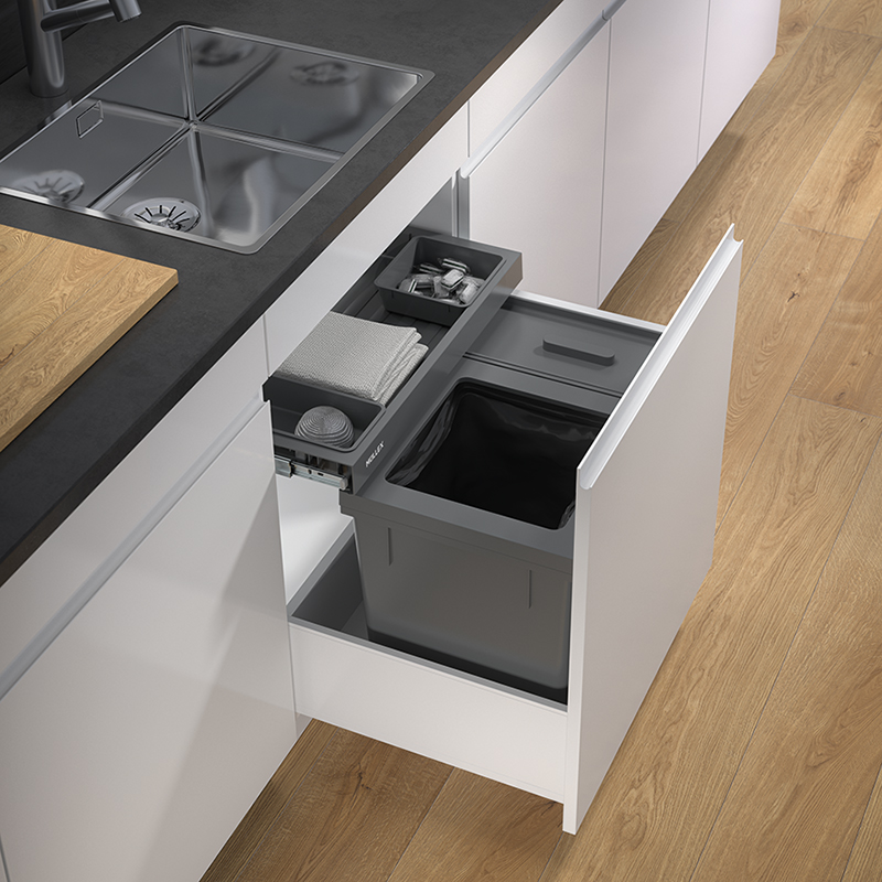 Anthrazit. Für jede handelsübliche Auszugsschublade mit einer Schubladentiefe von 400 - 500 mm. Für Korpuswandstärke 16 / 19 mm. Diese Ausführung der X-LINE ist geeignet für grössere Mengen an Biomüll, für mehr Stauraum und oder Putzutensilien. Entwickelt für Korpusse mit einer Breite von 600 mm, verfügt die Garnitur über einen 18 Liter Zusatzbehälter. Dieser extragrosse Zusatzbehälter wird begleitet vom 40 Liter fassenden Hauptbehälter für den normalen Haushaltsmüll. Mit X-LINE Technologie ausgestattet, lassen sich die 35 Liter Normabfallsäcke kinderleicht einspannen und befüllen. Die Premiumschublade, die die ganze Garnitur ergänzt, verfügt neben dem Vollauszug über zwei Zusatzschalen, in denen sich Spülschwämme und ähnliches ordentlich verstauen lassen.