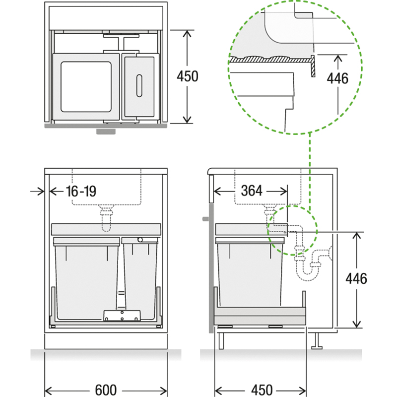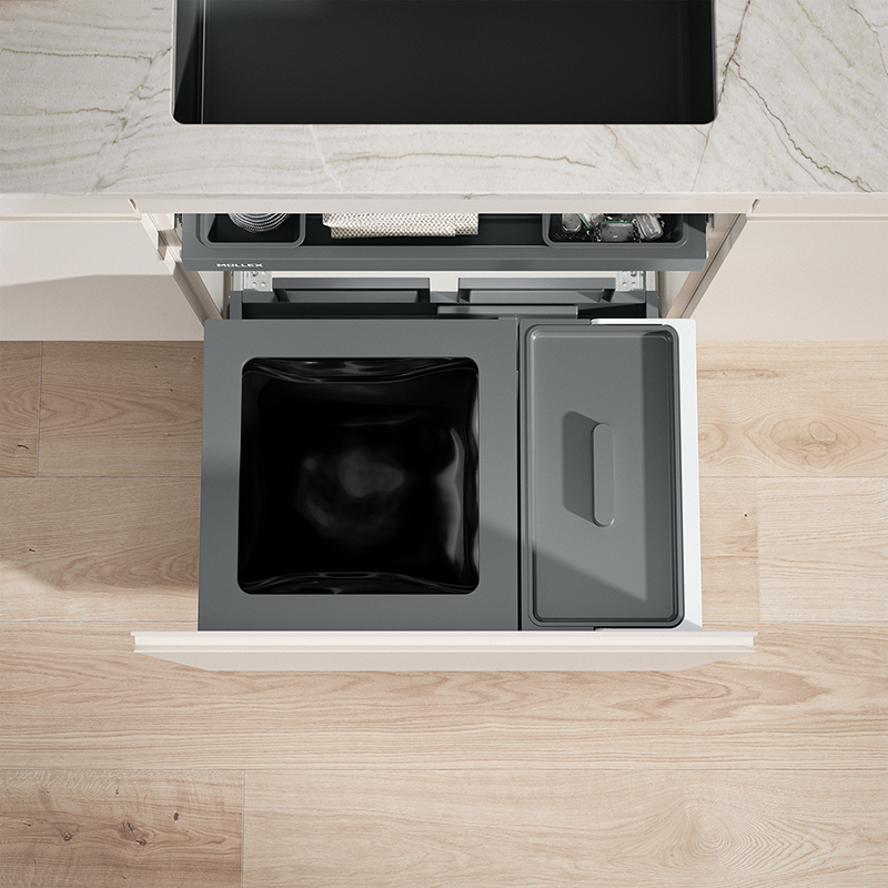 Dieses Komplettset für Korpusbreiten von 600 mm verfügt mit dem 18 Liter Zusatzbehälter über einen voluminösen Aufbewahrungsort für Recyclinggüter oder Putzutensilien, dieser grosse Behälter eignet sich optimal für grössere Mengen an Biomüll oder als zusätzlichen Stauraum im Küchenunterschrank, Herzstück des Abfallsystems bildet der 40 Liter grosse Hauptbehälter für den Müllsack, die im Set integrierte Schubalde Premium mit Vollauszug kann als obere Ablagefläche für Spülschwämme oder ähnliches genutzt werden, das System wird mit dem robusten Komplettschubkasten Pro geliefert