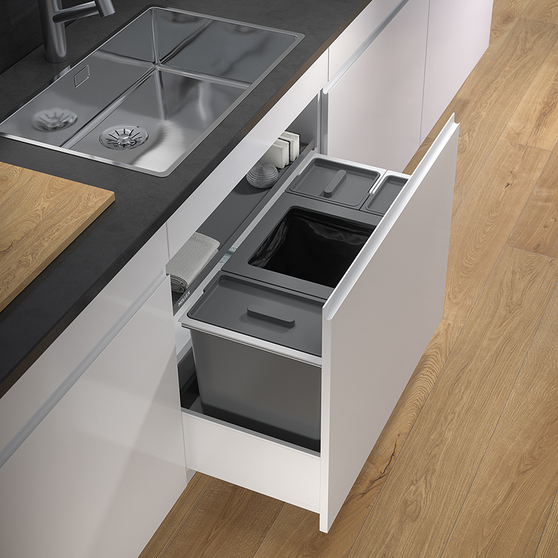 anthrazit, für jede handelsübliche Auszugsschublade mit einer Schubladentiefe von 400 - 500 mm, für Korpuswandstärke 16 / 19 mm, bei breiteren Korpussen mit 800 mm Breite sorgt das X80 L6 Basic Abfallsystem für Ordnung im Küchenunterschrank, der 40 Liter umfassende Hauptbehälter wird ergänzt mit fünf weiteren Behältnissen, diese eignen sich dank einem Volumen von bis zu 18 Litern für Bioabfälle und kleinere Recyclinggüter genauso wie für die Aufbewahrung von Küchenutensilien, einfachere Sackeinspannung mit vier beweglichen Sackspannern, in dem 40 Liter Hauptbehälterwerden die 35 oder 17 Liter Gebührensäcke richtig voll, Metalldeckel als Abdeckung der Behälter für mehr Stabilität