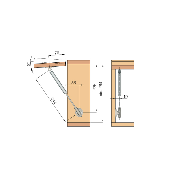 vernickelt mit Gasdruck-Zylinder, hebt die Türe bis zur maximalen Öffnung an, der Hebevorgang wird anfangs zügig ausgeführt und kurz vor der vollständigen Öffnung sanft abgebremst, ohne Montageteile