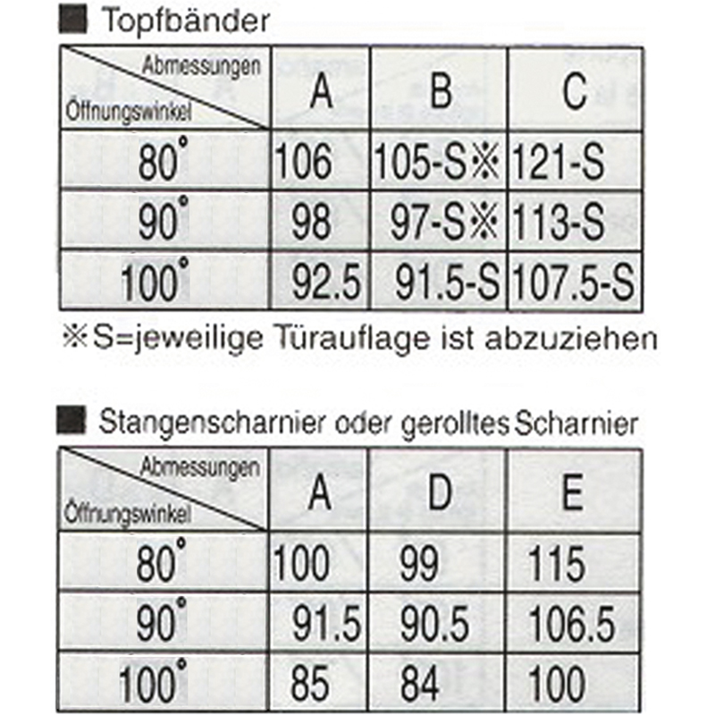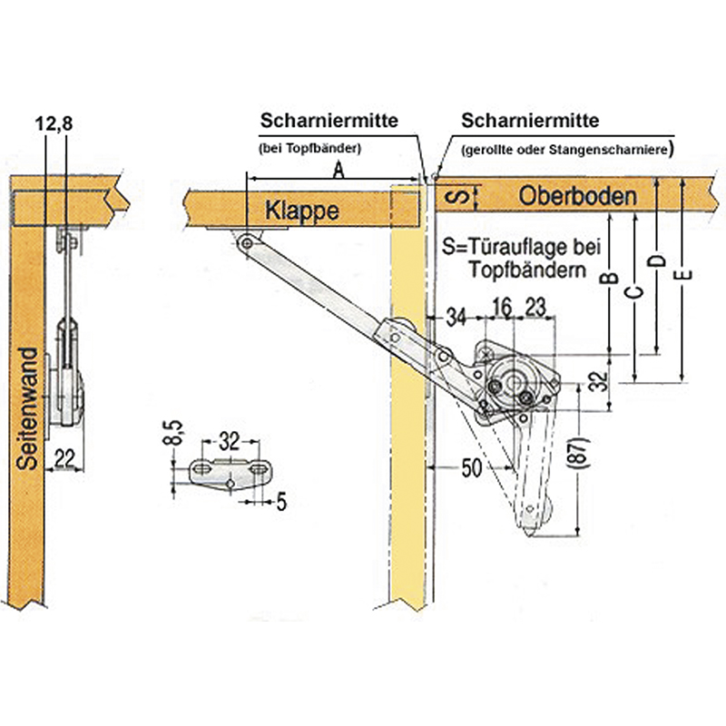 Klappenhöhe (cm) x 0,5 x Gewicht (kg) = Drehmoment (kg-cm/Paar) - Verhindert das Zuschlagen von Klappen. Achtung: Klappe nicht von Hand zudrücken! Es können sonst Schäden am Beschlag entstehen.