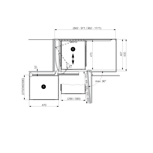 beste Platzausnutzung und vollständig ausziehbare Stellflächen für Eckmöbel mit scharnierten Türen
