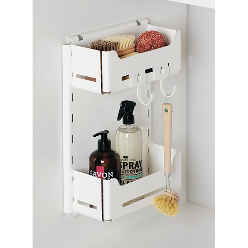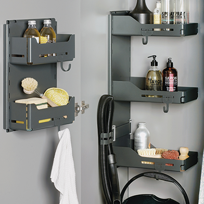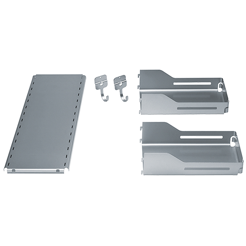 Stahlblech beschichtet, links und rechts an der Seitenwand wie auch an der Schranktür im Ober- und Unterschrank montierbar, höhenverstellbar, die Einhängetablare und Haken können individuell dem Staugut angepasst werden, Tablare mit geschlossenem Boden verhindern das Umfallen von Flaschen oder Durchfallen von Kleinutensilien