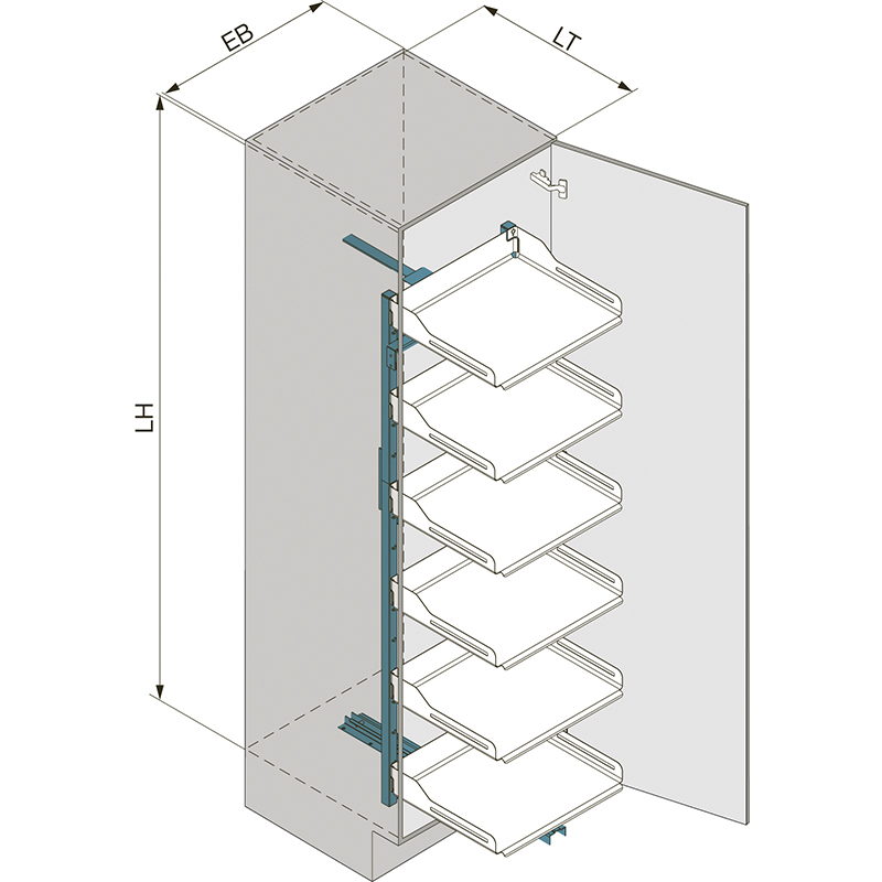 - Die obere Führung wird oben an den Korpusseiten montiert, dadurch besteht keine direkte Abhängigkeit zur lichten Schrankhöhe, die obere Führung ist diskret unter dem obersten Tablar angebracht, somit ist das Tablar von oben frei zugänglich und der Platz oben je nach Schrankhöhe flexibel nutzbar, die obere Führungsmechanik ist über die Seitenwand verschraubt, das kompakte Führungssystem ist kugelgelagert und der Ausfahranschlag gedämpft, das gesamte Gewicht wird so über den Boden getragen und über eine einfache Führungsstange mit der Türe verbunden
