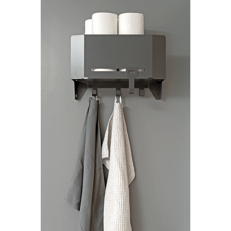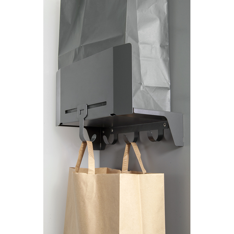 die Recyclingstation auf kleinstem Raum, Wertstoffe wie PET, Karton, Glas, Alu-Dosen werden meist in handelsüblichen Einkaufstaschen aufgehoben und in diesen auch zur Sammelstelle gebracht, mit Sesam Bag werden diese Taschen auf kleinstem Raum einfach aufbewahrt, Ablage für bis zu 3 Taschen: 1 Tasche auf dem Metalltablar, 1 Tasche hängend am Metalltablar und 1 Tasche auf dem Möbelboden unterhalb des Metalltablars, ideal kombinierbar mit dem Putzschrank-Regal Sesam Standard, Sesam Mini, oder dem neuen Kehrschaufel- und Besenhalter, Halterung mit 3 fixen Haken und 1 Zusatzhaken zum Aufhängen der Recyclingtasche oder für andere aufhängbare Utensilien, weitere Anwendungsmöglichkeiten: in der Küche, im Bad, als Mini-Garderobe im Eingangsbereich oder im Hobbyraum für Schürzen und Tücher