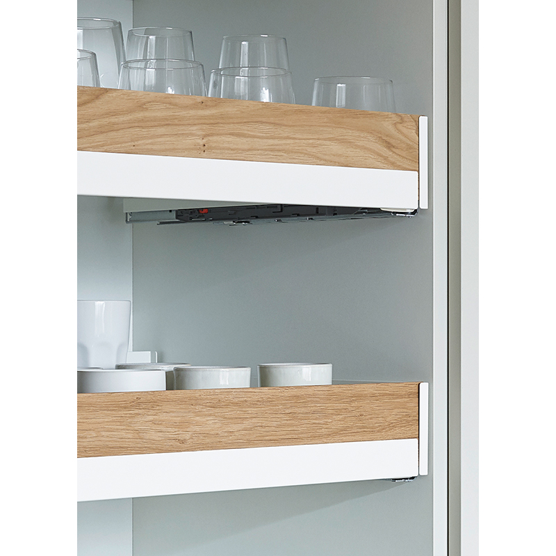 Eiche natur, Eiche gebeizt, Relingeinsatz in den vorgesehenen Schlitz des Liro-Tablars führen, werkzeuglose Montage