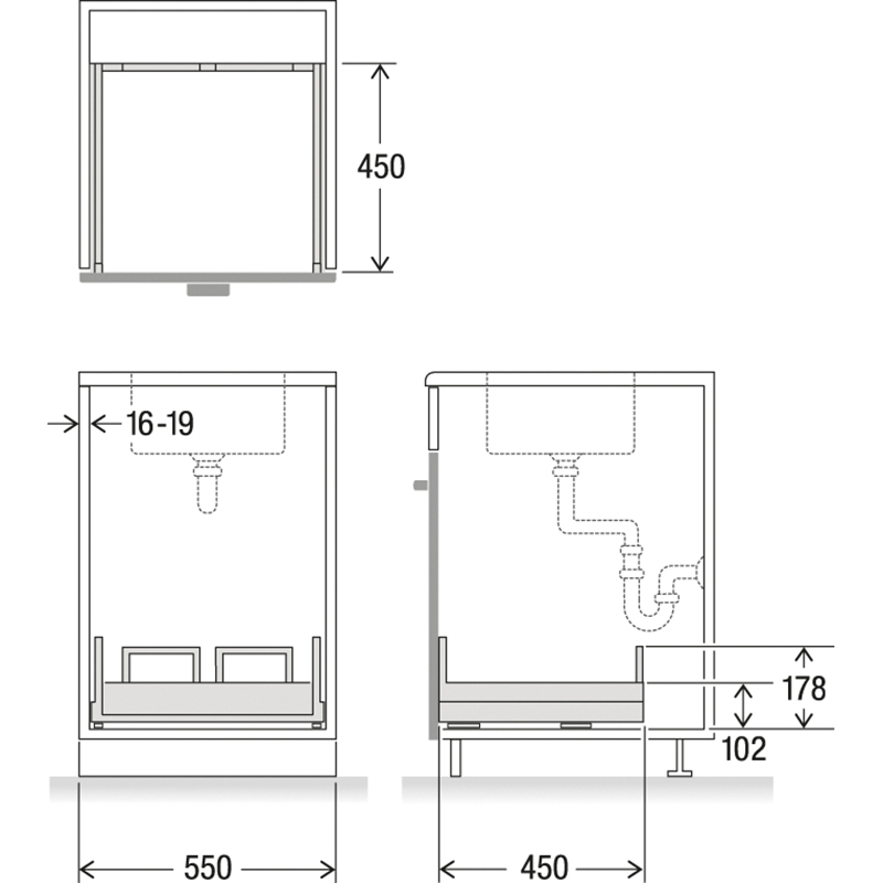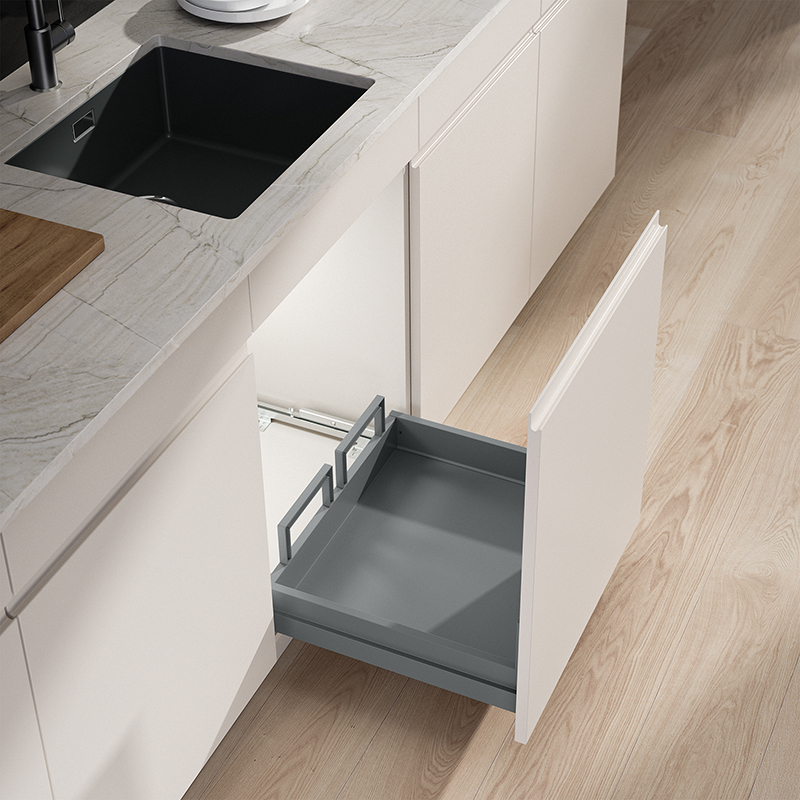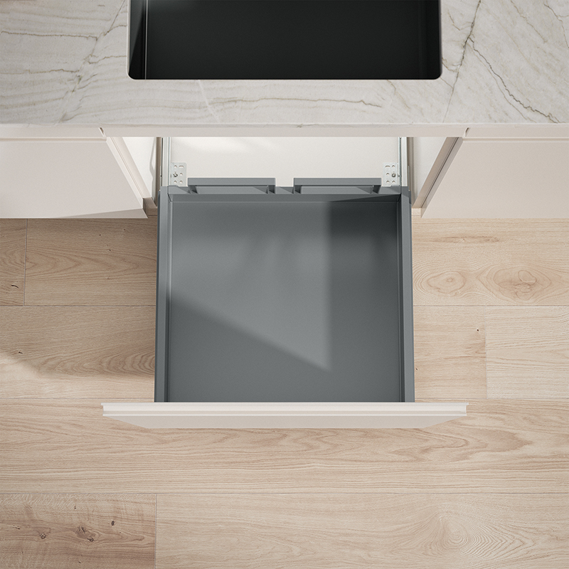 Die strapazierbare Konstruktion und bewährte Grass-Auszugstechnik machen diesen Komplettschubkasten für X-LINE Systeme für eine Korpusbreite von 550 mm zu einem zuverlässigen Helfer bei der Abfallentsorgung, er ist vielseitig einsetzbar, sowohl für neue Küchen als auch im Rahmen von Renovierungen, seine Konstruktion ist darauf ausgelegt, selbst unter hoher Belastung und bei Einwirkung von Feuchtigkeit, Schmutz und im täglichen Gebrauch dauerhaft zu funktionieren, dank seiner durchdachten Bauweise lässt er sich schnell und mühelos installieren und kann Gewichte bis zu 70 kg tragen, zudem ermöglicht die integrierte 3D-Verstelltechnik eine millimetergenaue Ausrichtung der Fronten