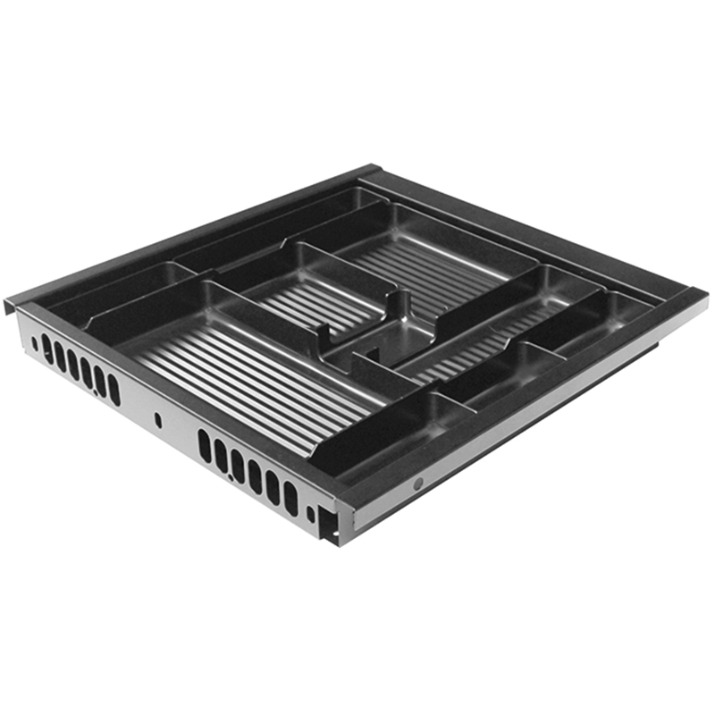 Stahlblechkonstruktion schwarz RAL 9005, mit Utensilieneinsatz aus Kunststoff, mit Teilauszug OrgaAer, mit 1 Dämpfer Soft-close für schwebeleichten Lauf