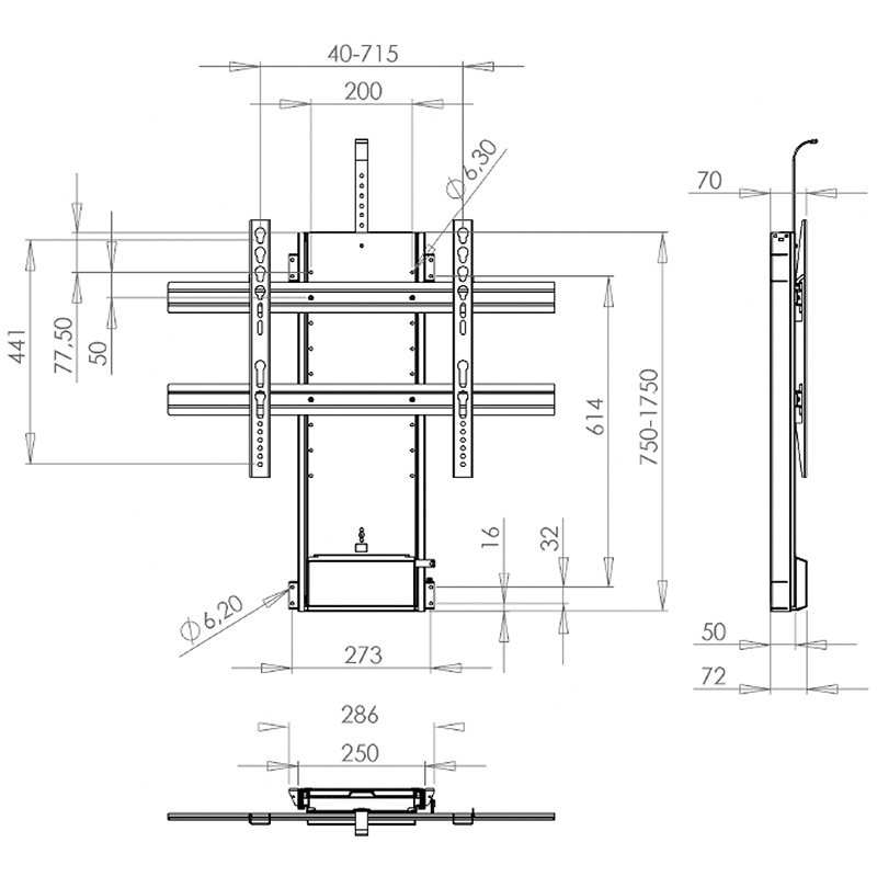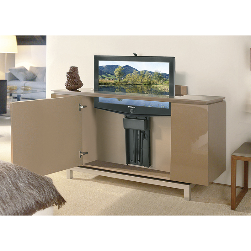 schwarz pulverbeschichtet, die Lifteinheit wurde entwickelt zur Höhenverstellung von Flachbildschirmen, kommt jedoch auch bei vielen anderen Anwendungen zum Einsatz, zum Beispiel bei Spiegelschränken, PC-Bildschirmen und Küchenoberschränken, mit Kollisionsschutz (Lift stoppt beim Absenken, wenn er gegen ein Hindernis fährt und steigt danach wieder nach oben)