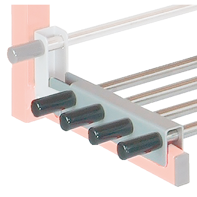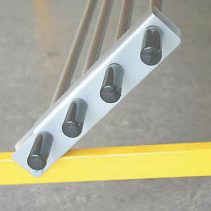Schuhrost für Sitzbankkonsolen aufklappbar, passend zu sämtlichen Makk Sitzbankkonsolen, mit 4 Edelstahlrohren Ø 13 mm, Endkappen aus PVC schwarz und Halter aus Aluminium eloxiert, ohne Schuhrostrohr als hinteren Anschlag