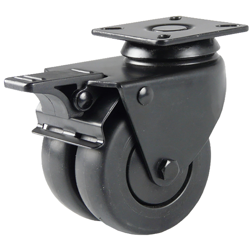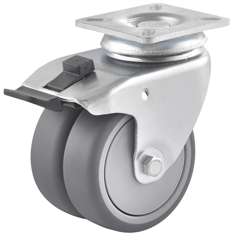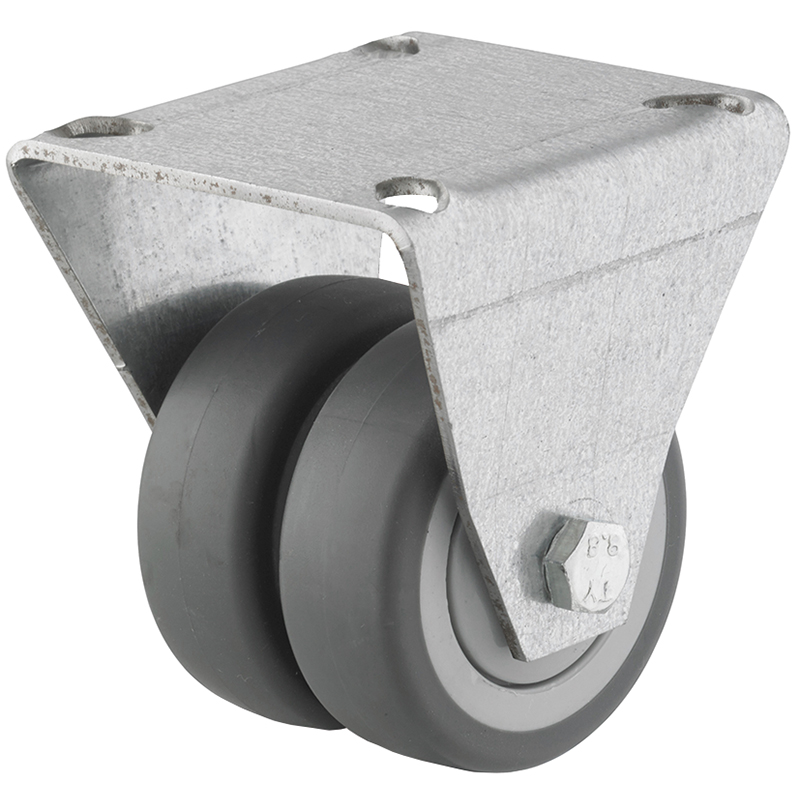 Stahlblechgehäuse verzinkt oder schwarz, Gabelkopf mit 2-facher Kugellagerung, Lauffläche aus thermoplastischem Gummi grau oder schwarz, spurlos, Radachse verschraubt, Radkörper aus Polypropylen mit Kugellager und Fadenschutz, temperaturbeständig -20° bis +70° C