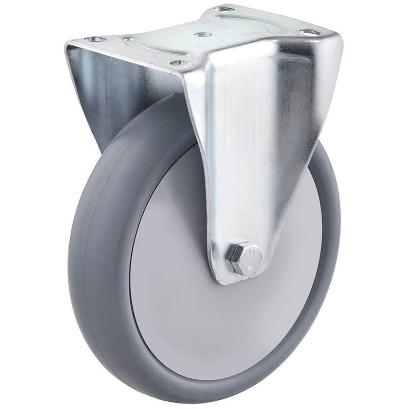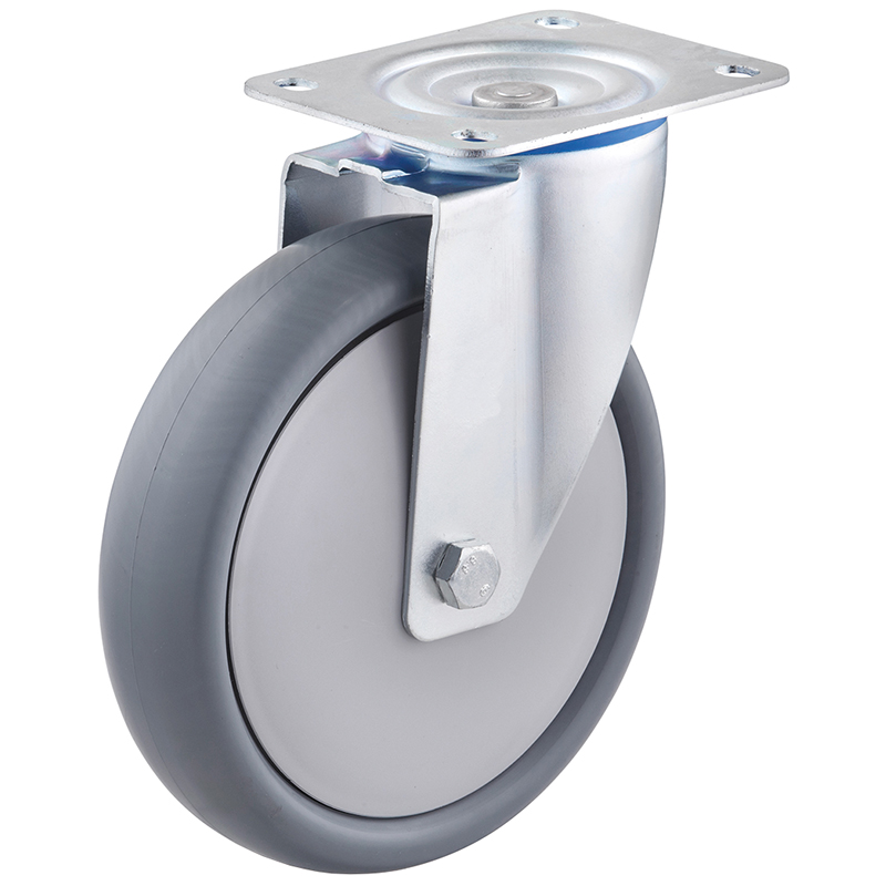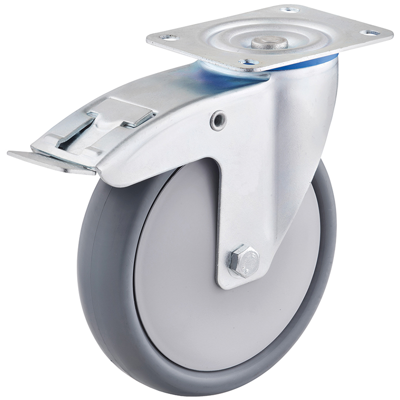 Stahlblechgehäuse verzinkt, Gabelkopf mit 2-facher Kugellagerung und Abdichtung, Lauffläche aus thermoplastischem Gummi grau, spurlos, Radkörper aus Polypropylen mit Kugellager und Fadenschutzscheibe, temperaturbeständig -20° bis +70° C