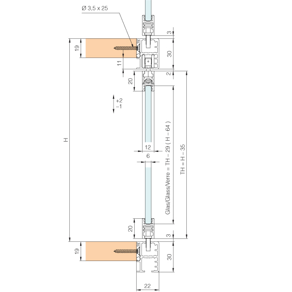 für Schrankschiebetüren aus Glas bis 16 Kilo, Glasdicke 6 - 6,35 mm, Türgrösse (Breite x Höhe) max. 1000 x 1400 mm, keine Korpusbearbeitung, dadurch auch nachträglich montierbar, die Lauf- und Führungsschienen werden mit Clip-Technik von vorne am Boden und Deckel befestigt, ohne Lauf- und Führungsschienen, ohne Vertikalprofil, ohne Zubehör