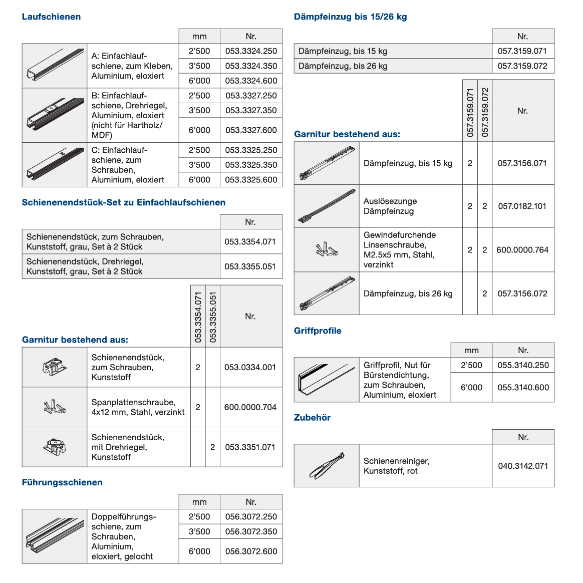 für oben im Korpus laufende Schrankschiebetüren aus Holz bis 26 Kilo, Türgrösse (Breite x Höhe) max. 1000 x 2200 mm, Türdicke 19 mm, die Laufschiene wird eingenutet, im Boden hat es keine Nut, Laufwerk zum Einclipsen, ohne Laufschienen, ohne Zubehör