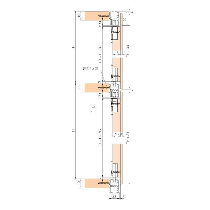 für Schrankschiebetüren aus Holz bis 16 Kilo, Türdicke 16 mm, Türgrösse (Breite x Höhe) max. 1000 x 1400 mm, keine Korpusbearbeitung, dadurch auch nachträglich montierbar, die Lauf- und Führungsschienen werden mit Clip-Technik von vorne am Boden und Deckel befestigt, ohne Lauf- und Führungsschienen, ohne Vertikalprofil, ohne Zubehör