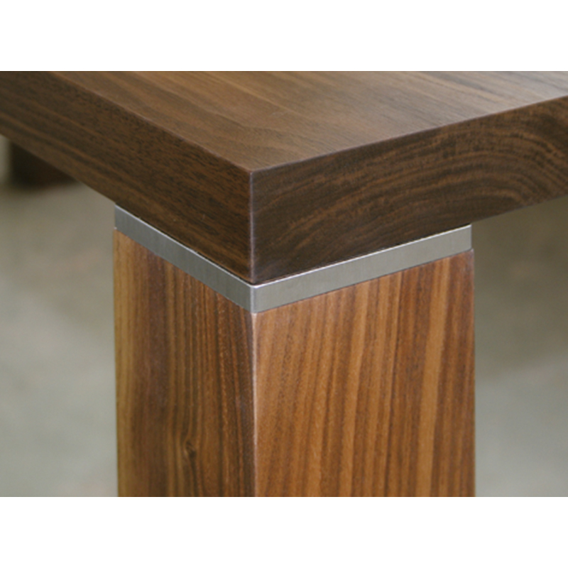 kantig, mit Eckradius ca. 3 mm, zum Aufstecken oben am massiven Holz-Tischfuss, zuvor muss ein Falz gefräst werden, am fertigen Tisch entsteht so der Eindruck einer schweren Montageplatte zwischen Tischplatte und Fuss