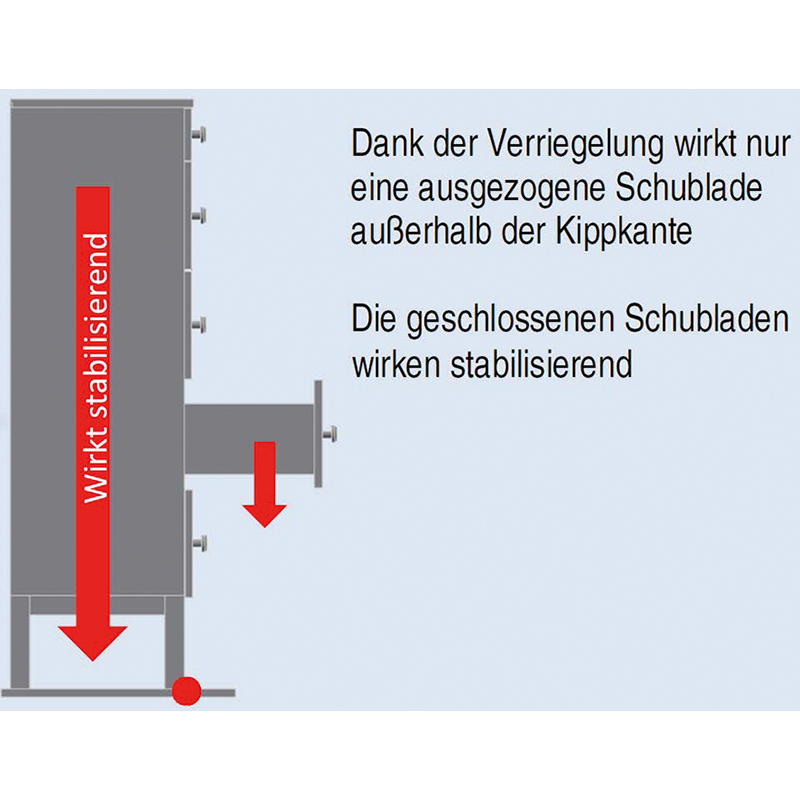 Universalbaugruppe für den individuellen Umbau zur Anpassung an die Zargenposition (Sperrstift) im Möbel, es können mehrere Schübe mit nur einem Schloss gesichert werden, Simultan Stop - Zentralverschluss mit Anti-Tilt-Funktion als Schutz gegen selbstöffnende Schubladen bei nicht verschlossenen, mobilen Möbeln, gegenseitige Verriegelung der Schübe, wie sie bei Bürocontainern oder Karteischränken erforderlich ist, Raster 32 mm