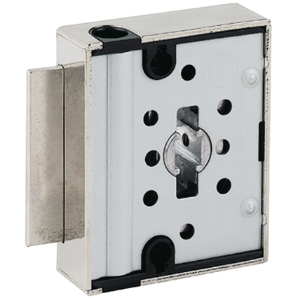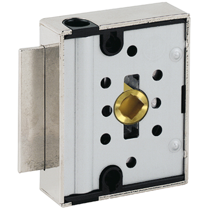 Schlosskasten matt vernickelt mit durchgehender Nylon-Stangenführung, Drehgriffbefestigung mit Inbus-Schraube, links und rechts verwendbar ohne Umstellung, gleiches Bohrbild für beide Dornmasse, ohne Stangen, ohne Fanghaken, ohne Exzenterkloben, ohne Schliessblech