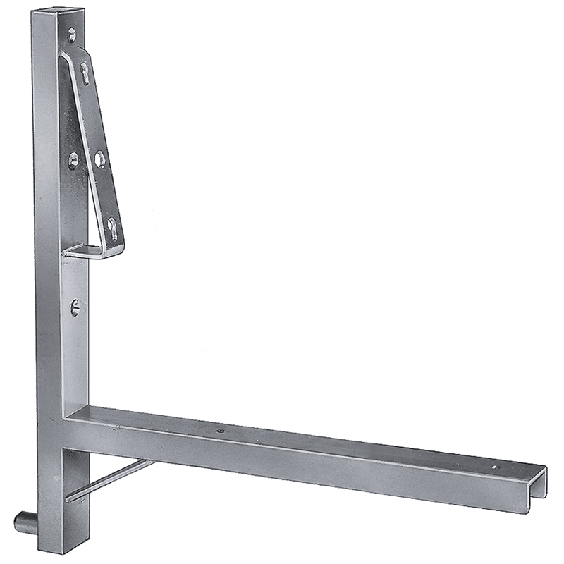 Stahl verzinkt, starke Ausführung, mit Verstärkungsstrebe und Stabilisierungsnocken, mit schräggestelltem Träger zum Einrasten der Rückenlehne, mit notwendigen Schraubenlöchern, Ausladung ab Vertikalstrebe 435 mm
