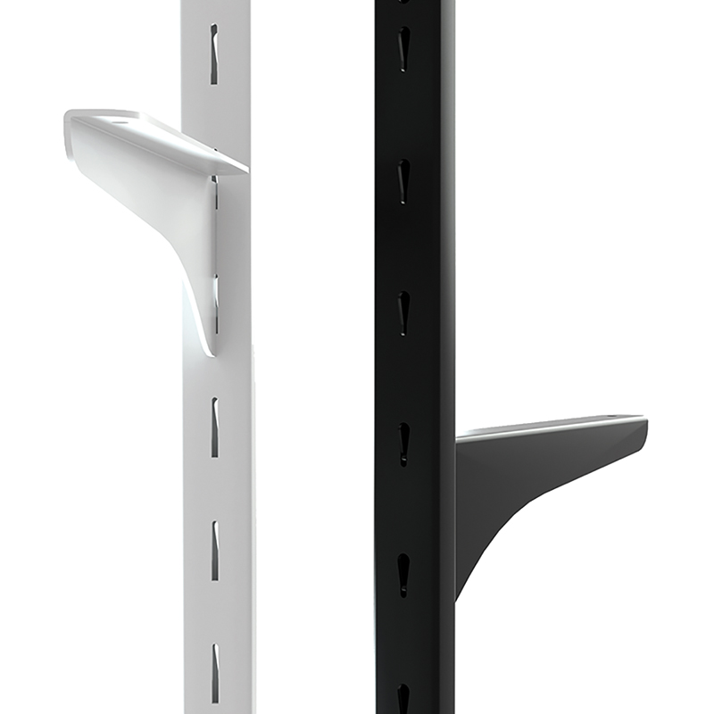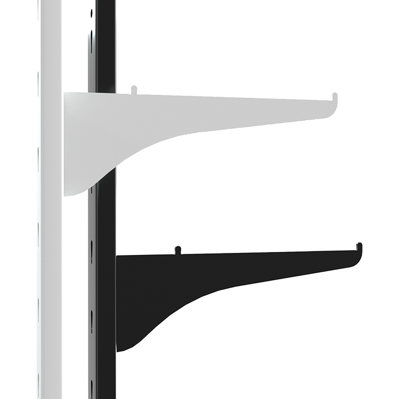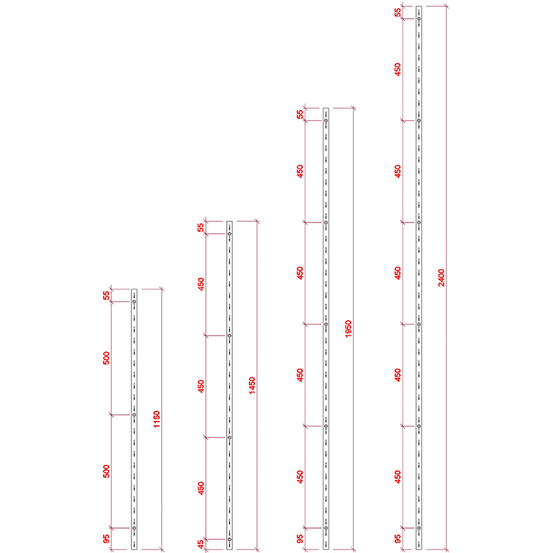 Das Stellschienenprofil besteht aus einem 25x15 mm pulverbeschichtetem Stahl Rechteckrohr, das an der Vorderseite für die Aufnahme der Konsolen geschlitzt ist, an der Rückseite sind tropfenförmige Öffnungen angebracht, welche die Konsolen mühelos einhängen lassen, diese Konstruktion gewährleistet eine hervorragende Seitenstabilität, da die Konsolen zusätzlich in der hinteren Wandung des Profils geführt werden, für die Befestigung sind in der vorderen Wandung Löcher vorhanden, die das Durchschieben von Schraubenköpfen ermöglichen, die Rückseite weist Löcher mit einem Durchmesser von 7,5 mm auf, was unter anderem die Verwendung von Betondirektschrauben erlaubt, das Stellschienenprofil ist in den Farben RAL 9005 (tiefschwarz) und RAL 9016 (verkehrsweiss) erhältlich