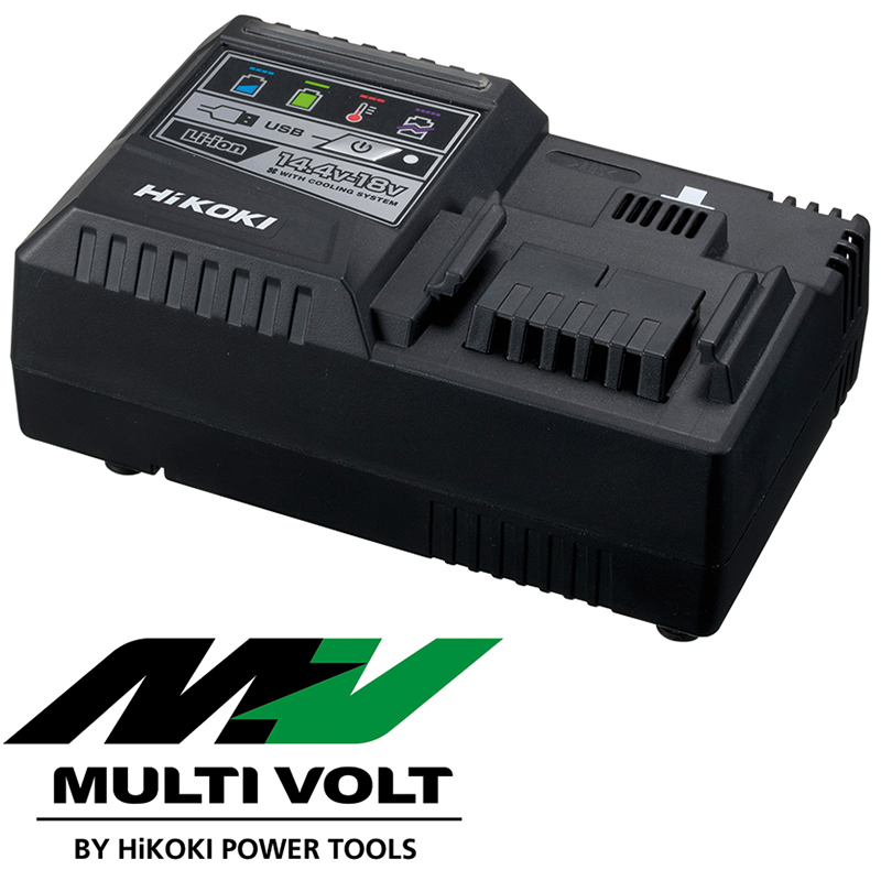 kompakt, leicht und handlich, passend zu MultiVolt Maschinen sowie 18V Maschinen von Hikoki, gesichert gegen Tiefenentladung, Überladung, Überlastung und Überhitzung, High-End Ladegerät der neuesten Generation, 4-stufige Ladezustandsanzeige, USB Ausgang 5V/2A als Ladegerät für Smartphones, integrierter Kühlventilator
