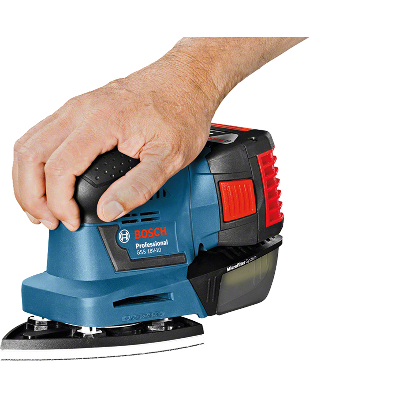 der kompakte Akku-Schwingschleifer, passend für jede Ecke, flexibles Arbeiten in jeder Situation durch 18 V Akku, Bosch Microfilter System für effiziente Staubabsaugung, ergonomische Bauform mit Softgripflächen für unterschiedliche Griffpositionen, Schleifplatte vom GSS 18 V-10 kann sowohl Klett- als auch Klemmpapier aufnehmen, perfekter Halt des Papieres ohne flattern und reissen, lange Lebensdauer durch abgedichtete Kugellager und robuste Bauweise, ohne Akku, ohne Ladegerät,