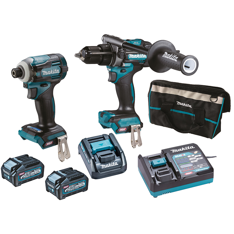 Lieferumfang: Schlagbohrschrauber HP001GZ, Schlagschrauber TD001GZ, 2x Akku BL4040 4.0 aH, Schnellladegerät DC40RA, Adapter ADP10, Tasche