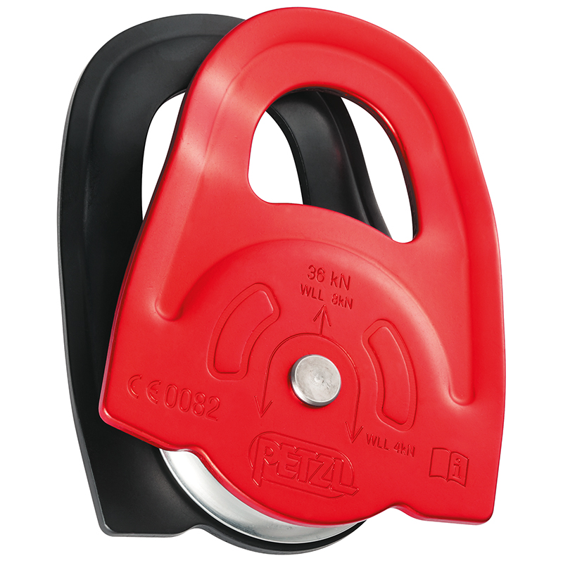 die speziellen Seitenteile sind für die Verwendung mit einem selbstklemmenden Prusikknoten in Systemen mit Rücklaufsperre ausgelegt, die grosse Laufrolle mit gekapseltem Kugellager gewährleistet einen hohen Wirkungsgrad, es können bis zu drei Karabiner eingehängt werden, Zertifizierungen: CE EN 12278, NFPA 1983 General Use,