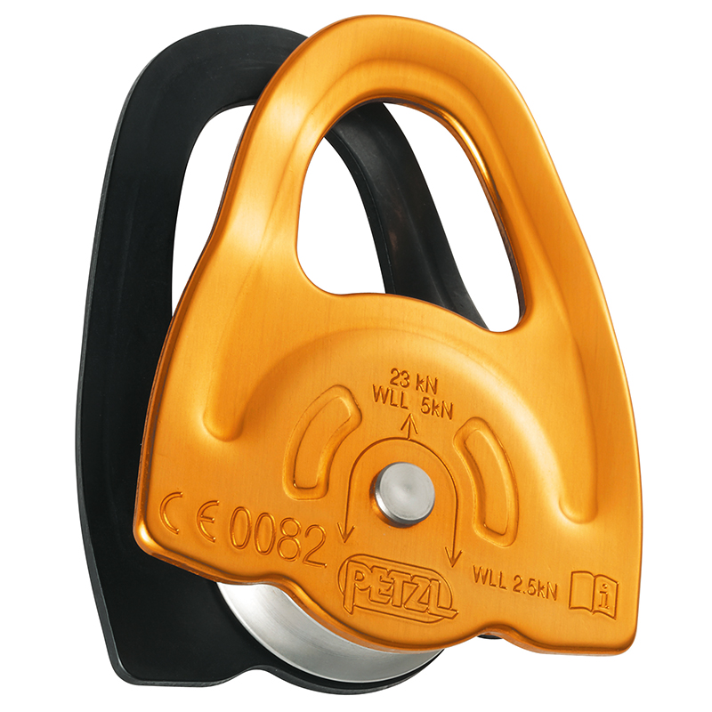 die speziellen Seitenteile sind für die Verwendung mit einem selbstklemmenden Prusikknoten in Systemen mit Rücklaufsperre ausgelegt, die Laufrolle mit gekapseltem Kugellager gewährleistet einen hohen Wirkungsgrad, leicht und kompakt,
