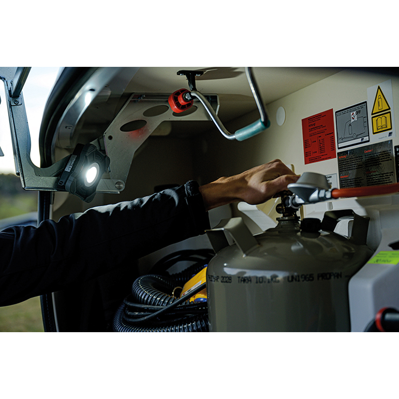 Kleine, kompakte LED Leuchte mit Kantenschutz und Gehäuse aus hochwertigem, robustem und schlagfestem Kunststoff - ideal für Baustelle, Werkstatt, Haus, Garten, Camping, diverse Outdoor-Aktivitäten, mit 4 Schaltstufen 100% - 50% - 25% - Flash Light-Funktion, einer Leuchtdauer von bis zu 6h und Ladeanzeige, Arbeitsstrahler IP54 (staub- und spritzwassergeschützt) mit Karabinerring und Magnet an der Rückseite für ein angenehmes und ergonomisches Halten und eine flexible Befestigung, kann dank integriertem Akku (Li-Ion-Akku 3,7 V/2,2 Ah mit Ladeanzeige) ganz einfach über das mitgelieferte Micro-USB-Ladekabel aufgeladen werden,