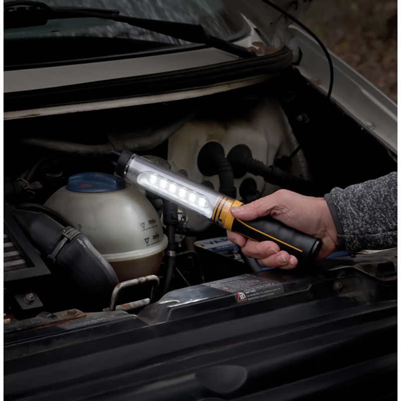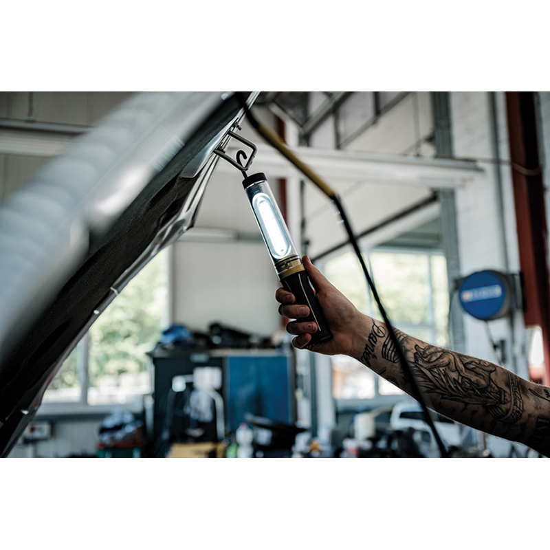 mit 12 superhellen SMD LED's, Schutzart IP54, verfügt über drei Schaltstufen 100% - 40% - 10% für lange Leuchtdauer, mit integriertem Magnet im Standfuss und stabilen drehbaren Haken zum Befestigen, mit ergonomischen Gummihandgriff und schlag- und bruchfester Schutzschale, ideal für den Einsatz in der Werkstatt