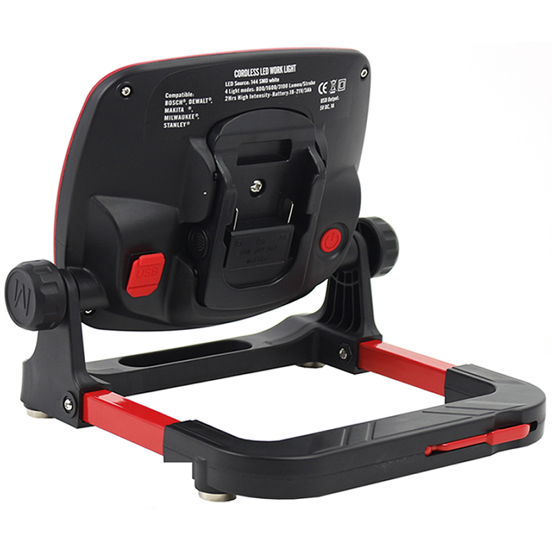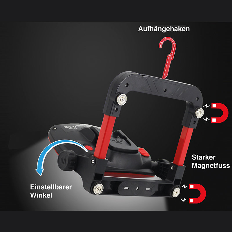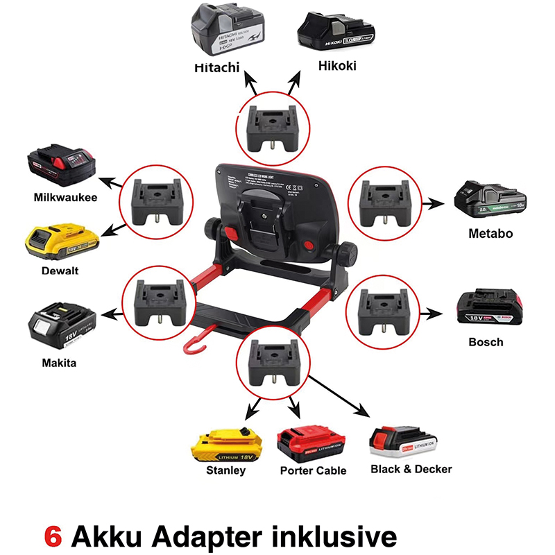 bietet den Komfort des kabellosen oder kabelgebundenen Betriebs und sorgt für eine helle und gleichmässige Ausleuchtung von Arbeitsbereichen, mit den Einstellknöpfen kann das Licht auf den gewünschten Winkel ausgerichtet werden, 3 Stufen, 800, 1500 und 3000 Lumen, an der Basis sind 4 starke Magnete angebracht, so kann der Strahler an jeder magnetischen Oberfläche befestigt werden, ausgestattet mit einem klappbaren, drehbaren Metallhaken mit 360 Grad Reichweite für jeden Winkel, mit USB Ladebuchse für das Laden von Smartphones und Tablets, kompatibel mit 18V-Batterien der Marken: Bosch, Black & Decker, Porter Cable, Stanley, Makita, Dewalt, Milwaukee, Hitachi, Hikoki, Metabo