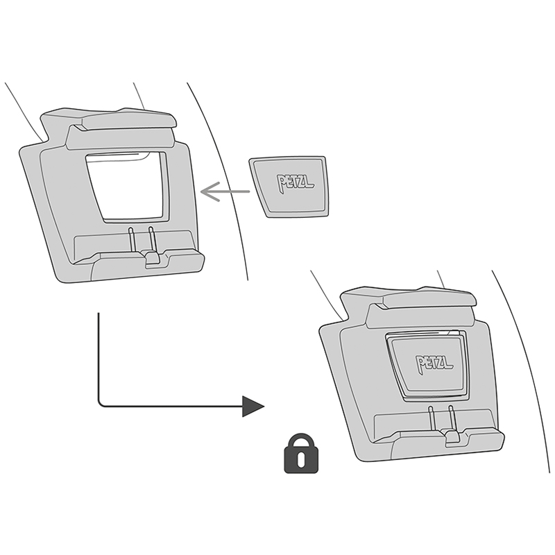 ermöglicht das Anbringen einer Stirnlampe an einem Petzl-Helm (oder an einem anderen Helm mit Befestigungsschlitz), ohne die Schwenkbewegung der Lampe zu beeinträchtigen, Möglichkeit einer dauerhaften Montage dank des abnehmbaren Kleberiegels, geeignet für die Stirnlampen der Reihen ARIA.
