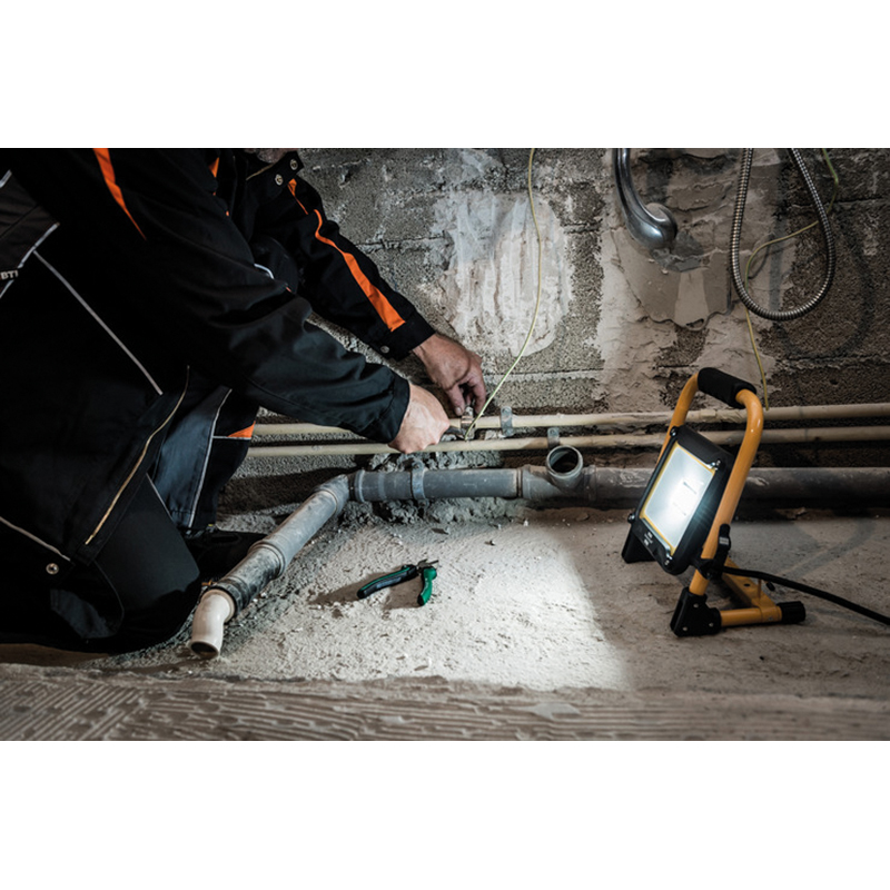 mit superhellen Everlight SMD-LEDs, Schutzart IP65, eignet sich für Einsatz im Aussenbereich, ideal für eine einhändige Arretierung des Strahlers, über eine Schnellverriegelung am Gestell, stufenlos schwenkbar, mit standfestem Stahlrohrgestell mit Kunststoff Schutzecken und ergonomisch geformtem Kunststoff Tragegriff, Kabellänge 5 m