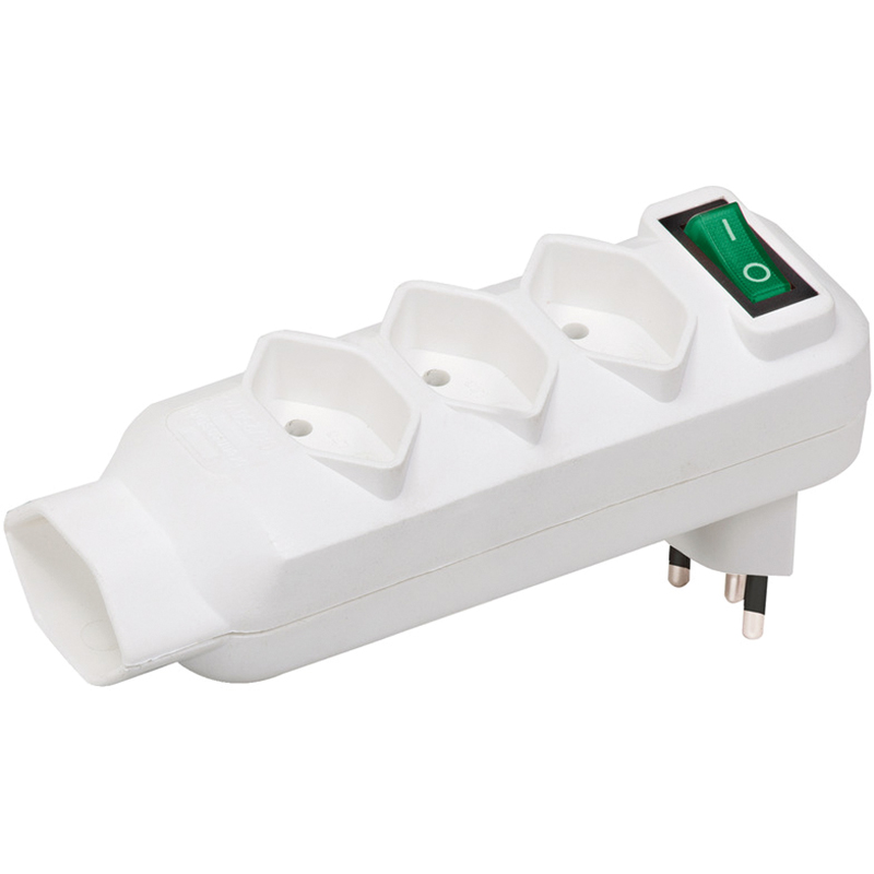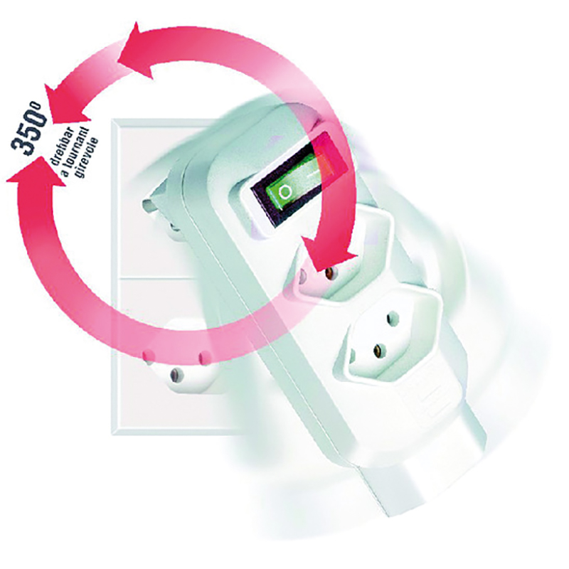 Kunststoff weiss, schlagfest, Stecker T12 ist bis 350° drehbar, Steckdosen T13 abschaltbar mit beleuchtetem Wippschalter, 1 Steckdose vertikal