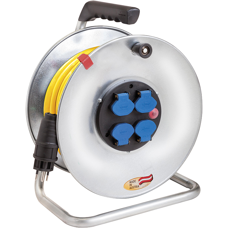 Trommelkörper aus Stahlblech, rostgeschützt verzinkt, auf besonders stabilem Tragegestell, ergonomisch geformter Handgriff, Überhitzungsschutz, Kontroll-Leuchte bei Überhitzung und Überlastung, Stecker T12/3, 230V/10A, 4 Steckdosen T13/3, 230V/10A, Stecksystem IP21,
