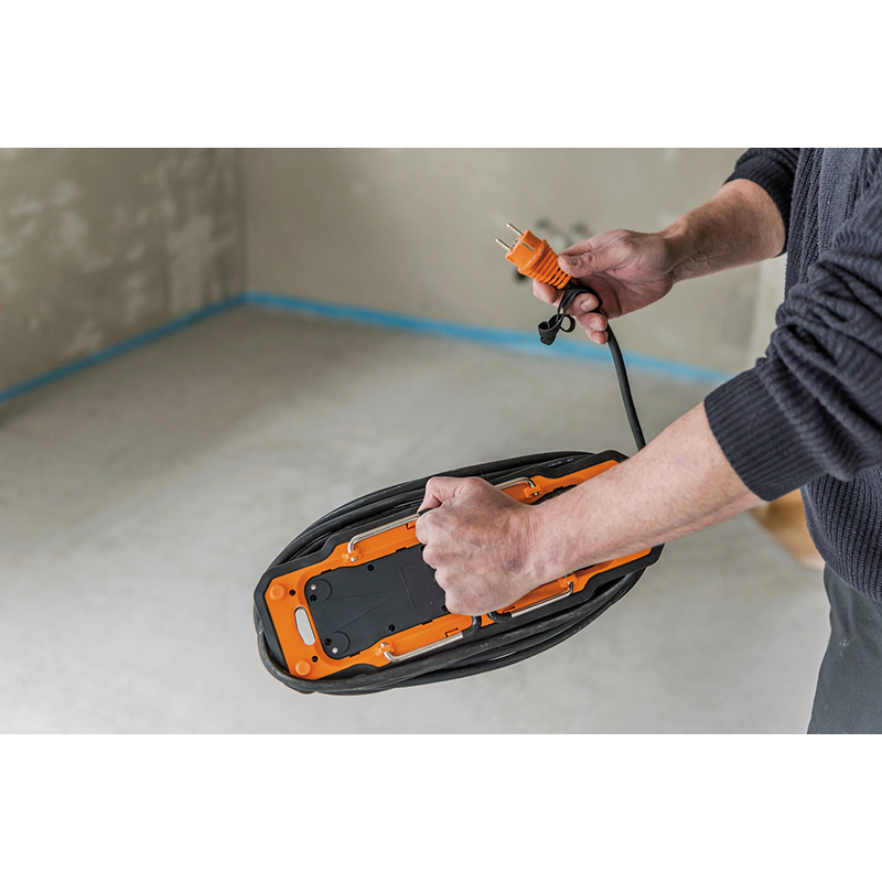 ergonomischer schlag- und bruchfester Steckdosenblock in robuster Ausführung, umlaufende, praktische Kabelaufnahme zum Verstauen des Kabels, Steckdosen T13 mit selbstschliessenden Klappdeckeln zum Schutz vor Verschmutzung, handliche Haltegriffe auf der Unterseite des Steckdosenblocks ermöglichen einfaches Auf- und Abwickeln des Kabels, Befestigungsband zum Fixieren des aufgewickelten Kabels