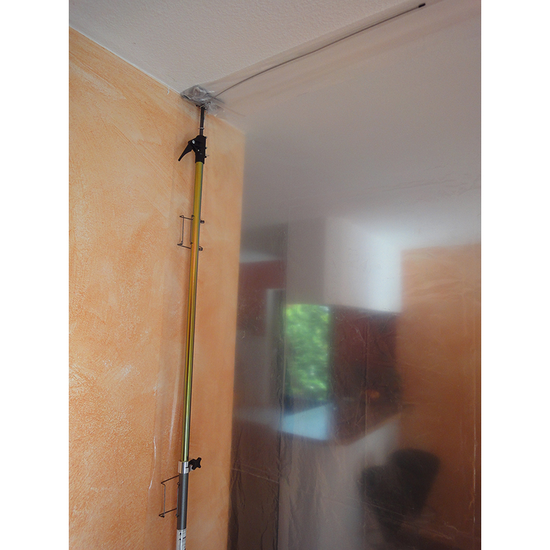 Topclamps dienen zur Abdichtung der Staubschutzwand oder -tür an der Decke, die Topclamp wird an der oberen Stange der QS30 /QS60 oder QS110 eingehängt, die Federwirkung drückt somit die Folie auf einer Länge von ca. 75 cm an die Decke, es können bis zu 2 Topclamps an einer Stütze eingehängt werden, auch über 90° verdreht ist dies möglich