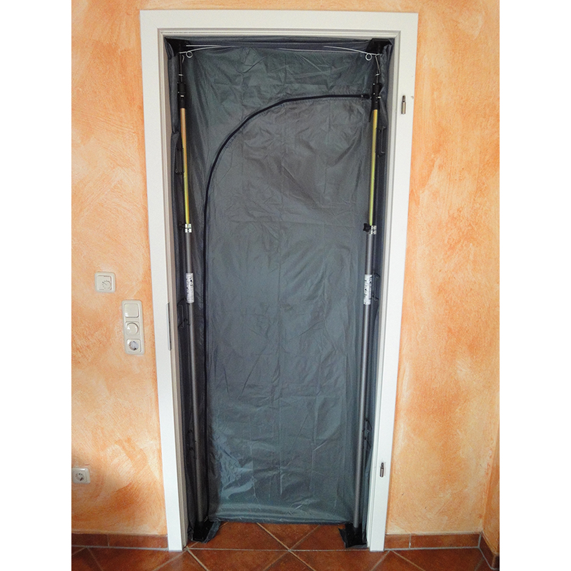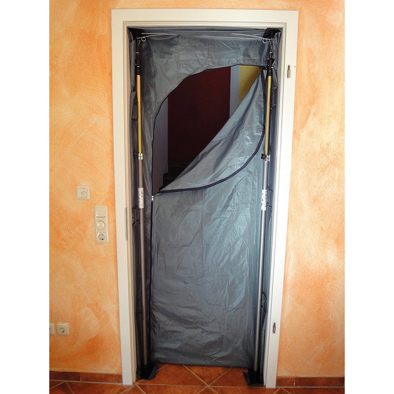 mit dieser Staubschutztür können Sie in kürzester Zeit eine staubdichte Tür mit 2 Deckenstützen erstellen, Sie können diese in eine Türzarge einbauen oder mitten in den Raum stellen, links und rechts an dieser Staubschutztüre befinden sich Klettverschlüsse an der Sie unsere Staubschutzwand problemlos staubdicht anhefeten können, so erhalten Sie in wenigen Minuten eine Staubschutzwand, die Sie ohne grossen Aufwand auf- und wieder abbauen können, Sie können diese beliebig (unendlich) verlängern